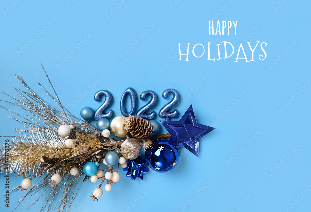 Happy Holidays greeting card. Festive winter decor - 2022 numbers, balls, bow and glittering elegant branch on blue background. New Year 2022 concept. minimal style composition. flat lay