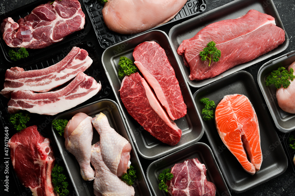 Set of fresh raw meat and fish in plastic boxes: veal, salmon steak, chicken, pork. Banner for the supermarket. On a dark background. Organic food.