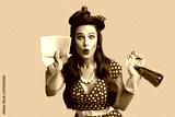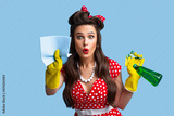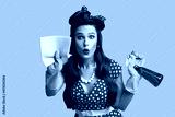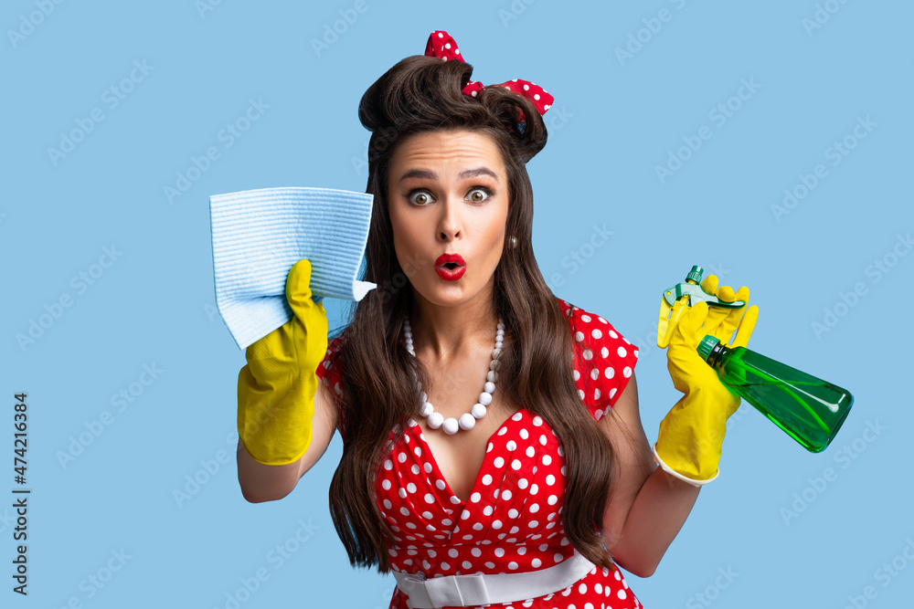 Surprised pinup lady in retro clothes cleaning screen with rag, using spray detergent on blue studio background