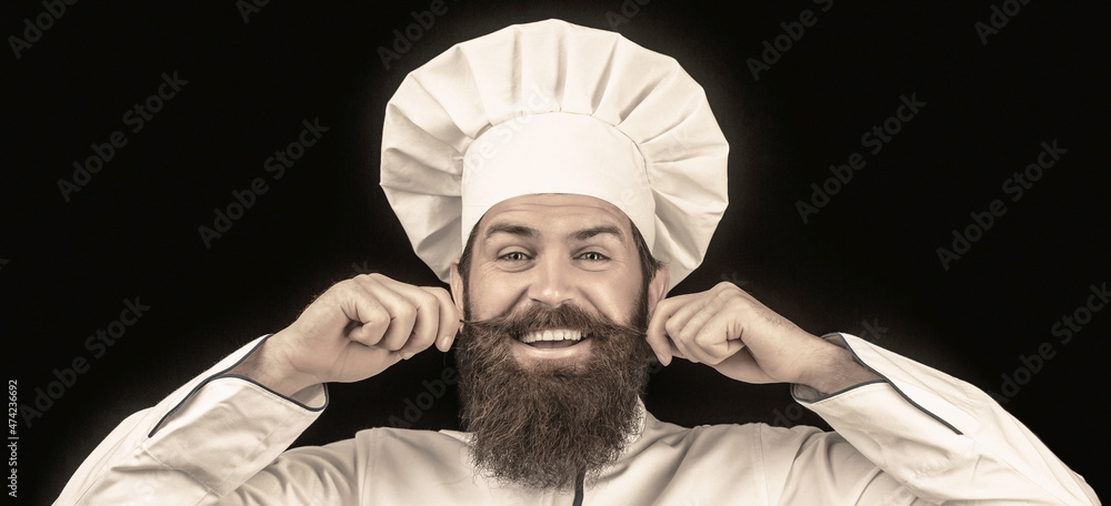 Cook hat. Bearded chef, cooks or baker. Bearded male chefs isolated on black. Funny chef with beard cook. Beard man and moustache wearing bib apron. Nappy man. Portrait of a happy chef cook