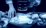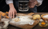 Women's hands, flour and dough. A woman in an apron cooking dough for homemade baking, a rustic home cozy atmosphere, a dark background with unusual lighting.