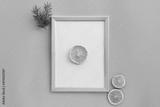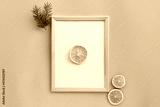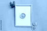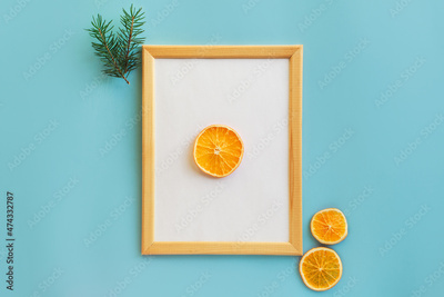 Winter New Year composition with wood frame, christmas tree branches and dried orange on light blue background. Front view, flat lay, mock up, copy space, place for text. Greeting minimal card