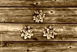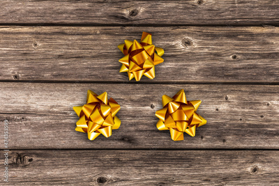 Gift golden bow with stars composition on old wood background. Winter, sale and seasonal concept. Merry Christmas, New Year, celebration banner. flat lay, top view, space or place for text