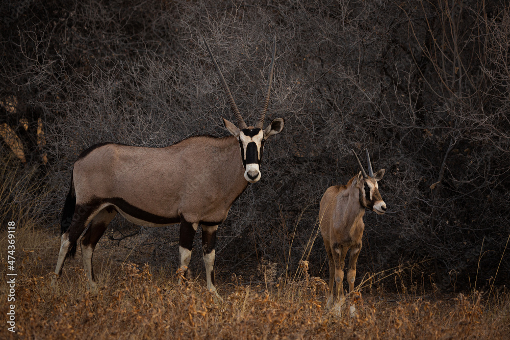 Two Gemsbok Antelopes (Oryx gazella) in Etosha National Park, Namibia. South Africa