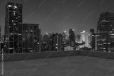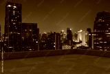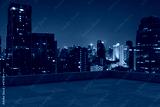 Panoramic Bangkok skyline view, concrete observatory deck on rooftop, night time. Asian corporate and residential lifestyle. Financial city downtown, real estate. Product display mockup empty roof