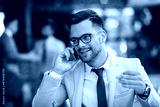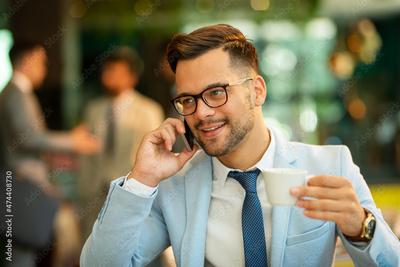 Smiling businessman with smartphone and drink coffee in cafe bar