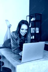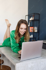 young smiling woman in dress at home with laptop and champagne, freelance worker