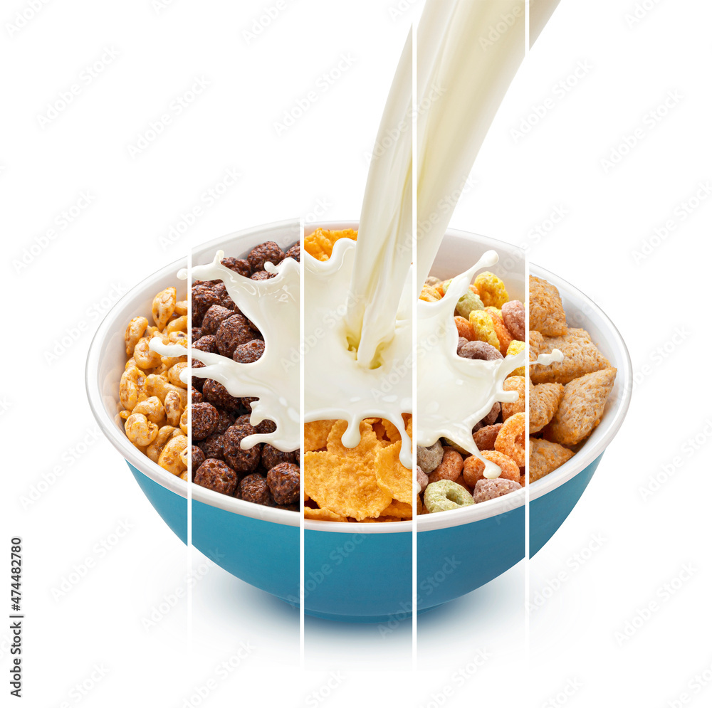 Cereal breakfast collage, granola and corn flakes with pouring milk
