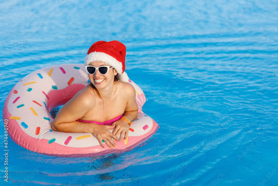 attractive young woman in santa hat and sunglasses relaxing on inflatable ring in swimming pool