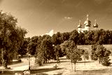 Strelka park and Assumption Cathedral in summer. Yaroslavl city, touristic Golden Ring in Russia.
