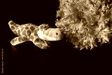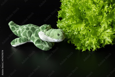 Frieze lettuce and toy plush crocodile on a black background. The concept of vegetarian food, children's menu