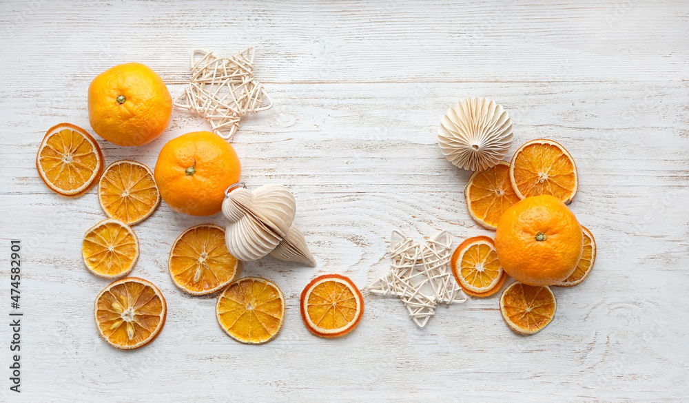 fresh tangerines, dried citrus slices and festive decorations on white wooden background. Christmas and New Year holidays, festive winter season. Cozy mood. minimal design. flat lay