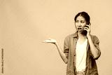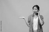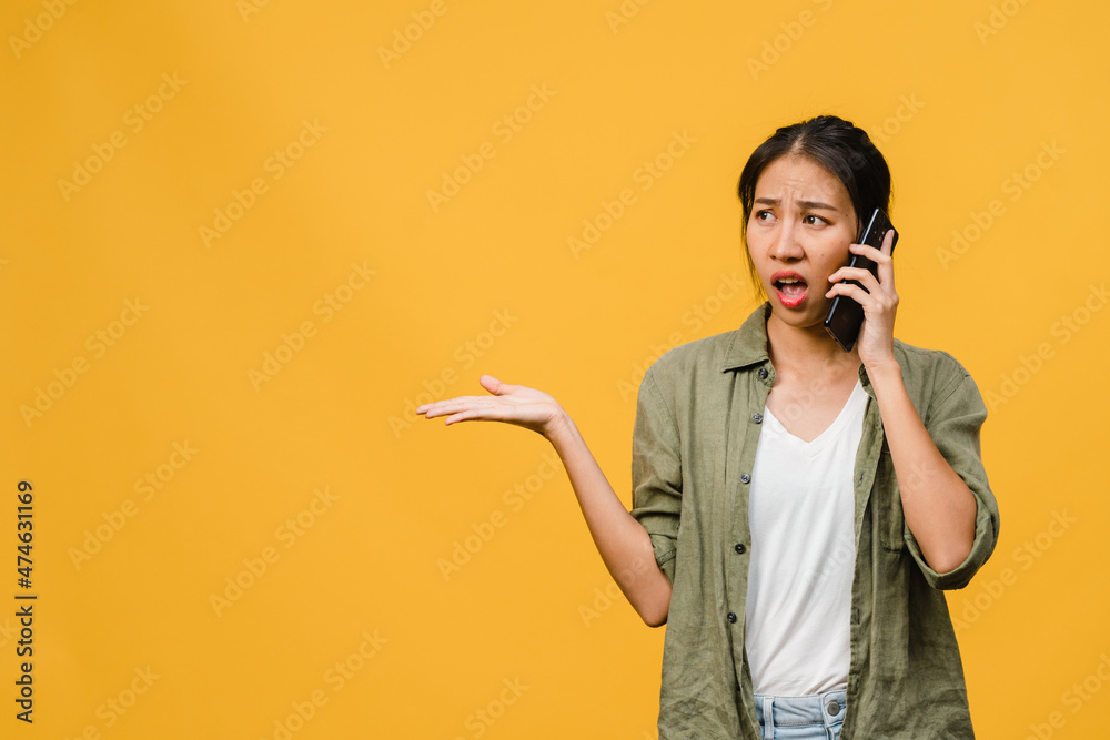 Young Asia lady talk by phone with negative expression, excited screaming, cry emotional angry in casual cloth and stand isolated on yellow background with blank copy space. Facial expression concept.