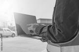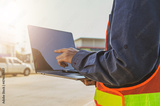 Engineer holding laptop computer send data work internet technology , Engineer construction inspection building project