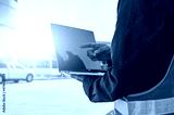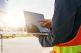 Engineer holding laptop computer send data work internet technology , Engineer construction inspection building project