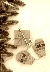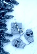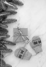 mittens, gift box, candy canes and fir tree branches on marble background. New year and Christmas holidays concept. symbol of festive winter season. flat lay. copy space