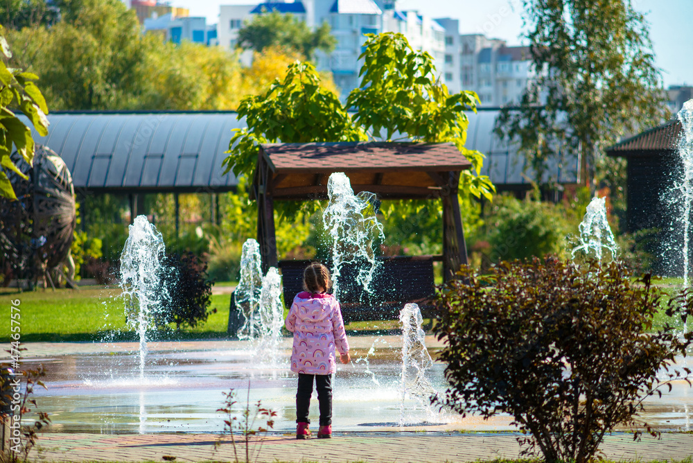 A child stands by the fountain
