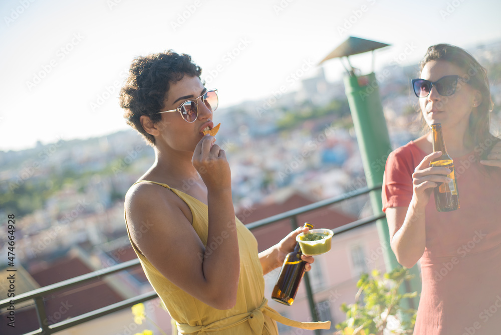 Young woman with curly hair in sunglasses eating chips. Girl with long hair in yellow dress having snack. Friends in background. Party, friend concept