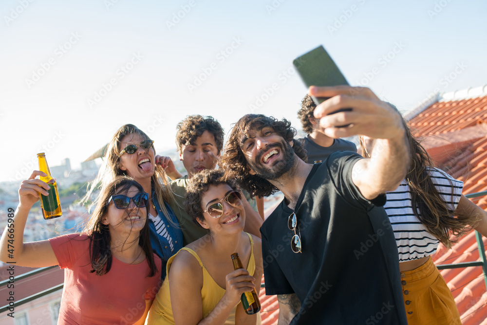 Pleased friends taking selfie at party. People of different nationalities holding brown bottles, making faces. Taking pictures with phone. Party, friendship, social media concept