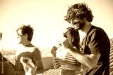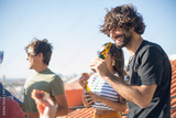 Young man with curly hair drinking beer at party. Guy with dark hair in black T-shirt holding bottle. Friends in background. Party, friend concept