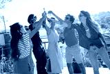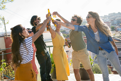 Joyful friends at party on sunny day. People of different nationalities drinking beer at terrace roof, clinking bottles. Party, friendship concept