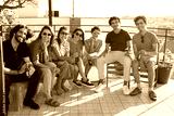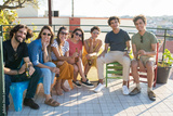 Smiling friends at rooftops terrace party. People of different nationalities holding beer bottles, sitting, looking at camera. Party, friendship, social media concept