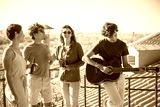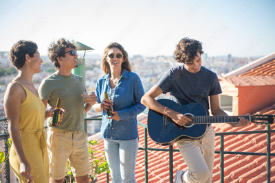 Joyful friends at party on sunny day. People of different nationalities drinking beer at terrace roof, playing guitars, talking. Party, friendship concept