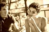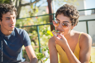 Young woman with curly hair in sunglasses eating tasty pizza. Girl with short hair in yellow dress having snack. Friend in background. Party, friend concept