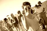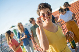 Portrait of nice woman with curly hair at party. Young girl in yellow dress holding beer. Looking through sunglasses. Friends of different nationalities in background. Party, friendship concept