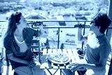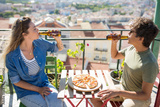 Relaxed male and female friends sitting at table at party. Young people in casual clothes sitting on terrace roof, talking, eating pizza and drinking beer. Communication, friendship concept