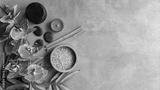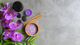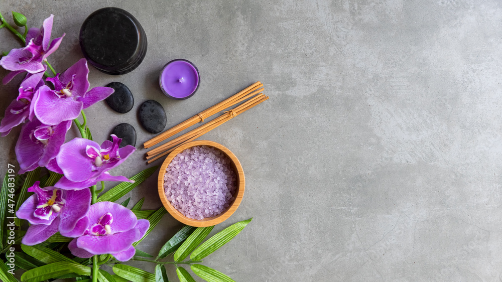 Thai Spa Treatments aroma therapy salt and sugar scrub massage with purple orchid flower on backboard with candle. Thailand. Healthy Concept. copy space for banner, top view