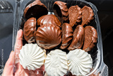 Closeup of vanilla and chocolate marshmallows called Zephyr, zefir storebought Russian dessert made with apple puree, gelatin and egg whites as traditional food