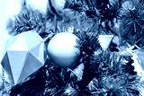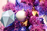 Christmas balls and glowing garlands on a purple christmas tree