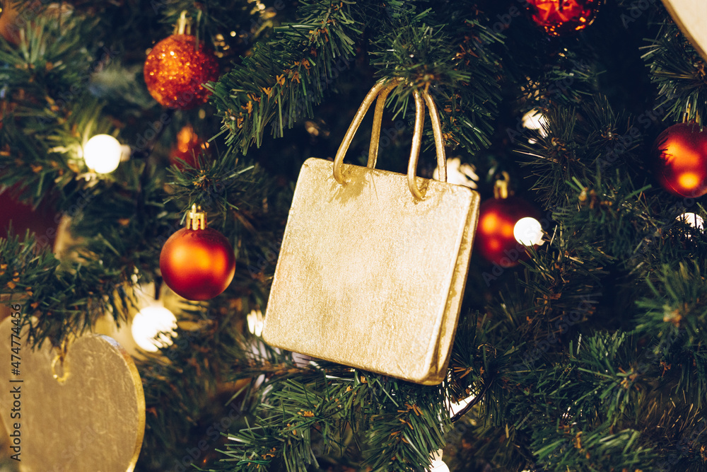 Gold gift bag decoration and red christmas balls on the christmas tree