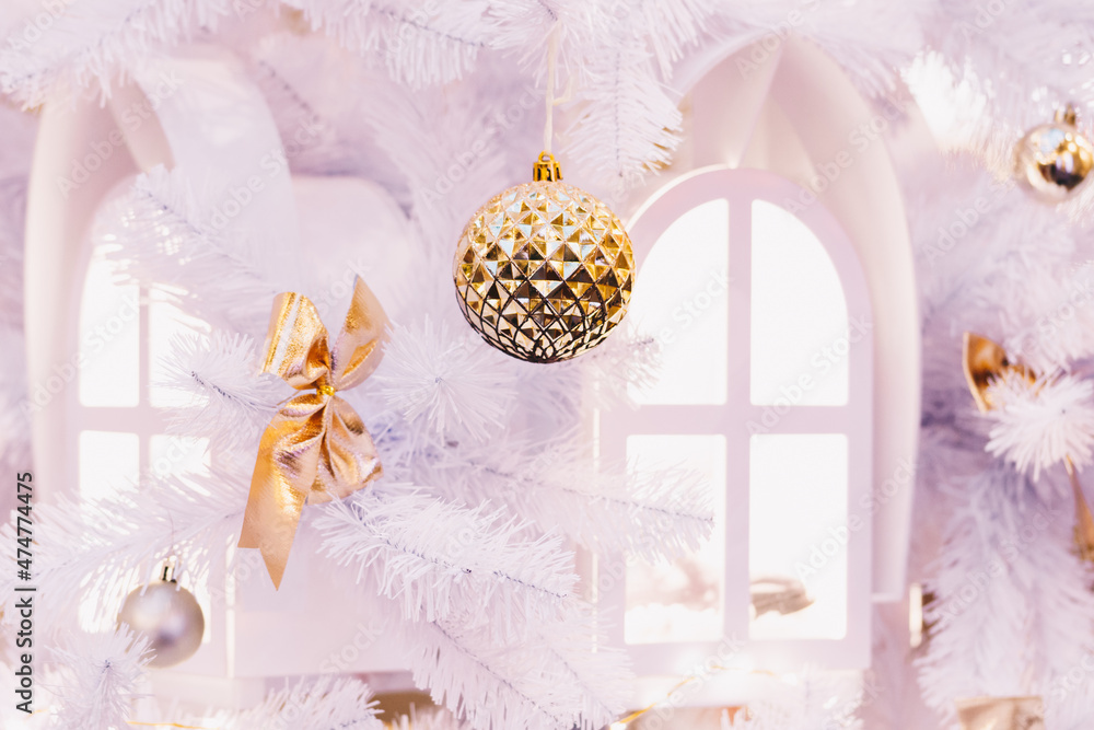 Christmas balls and garlands in the form of windows on a white Christmas tree
