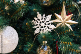 Gold and white christmas balls with sparkles on a christmas tree close-up