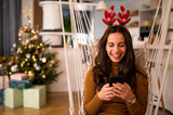 Young woman celebrating Christmas at home. Home is decorated with Christmas ornaments and lights. She using mobile phone