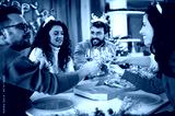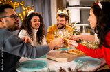 Young people celebrating a party, drink and dance . Group of friend toasting drinks while having fun at the disco club at night . Friendship and nightlife concept .