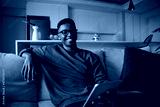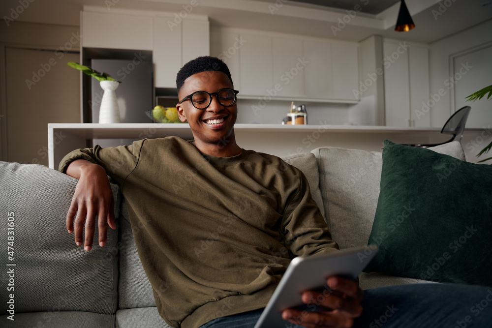 Young adult black male smiling at tablet while sitting on lounge on sofa