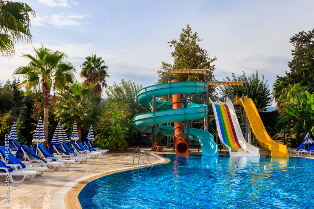 Swimming pool with water slide at the tropic summer resort
