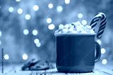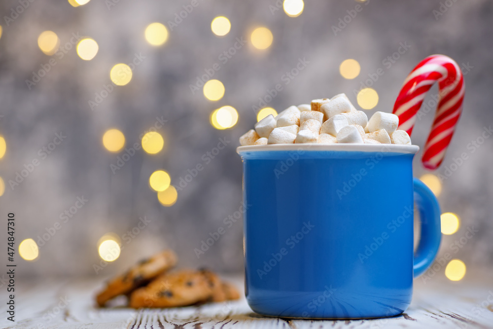 Hot cocoa with marshmallow and chocolate chip cookies on wooden table