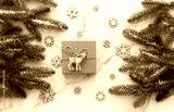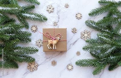 Gift box with cute deer toy, snowflakes and fir tree branches on marble background. Christmas and New Year holiday concept. winter festive season. flat lay. copy space