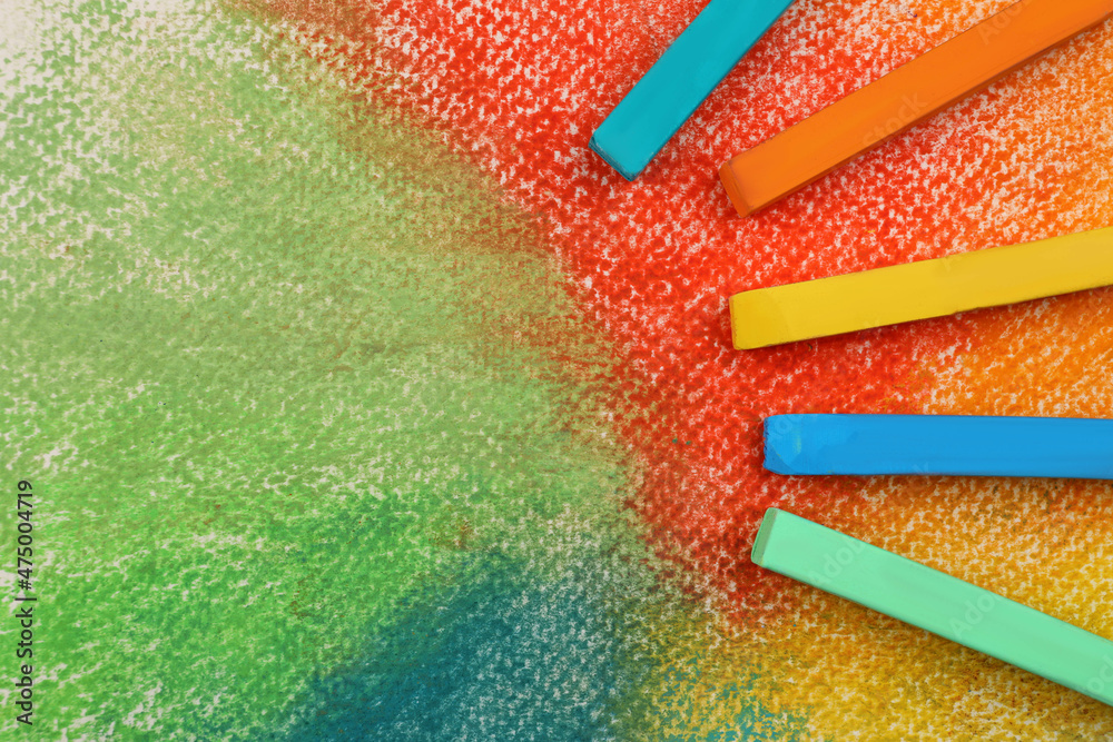 Colorful pastel chalks on abstract drawing, flat lay. Space for text