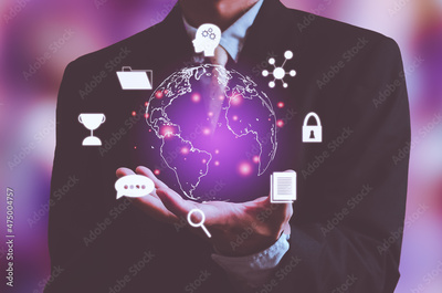 Virtual world technology metaverse concept. World and business icons, modern use of internet, data analysis, communication or online marketing.