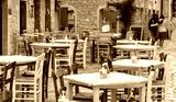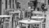 Greek tavern outdoor empty seats on cobblestone street, stone wall background, Areopoli, Mani Greece