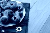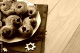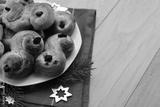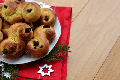 Traditional swedish saffron buns with raisins called Lussekatter on a plate on wooden table with festive Christmas decorations. Homemade baked buns