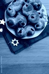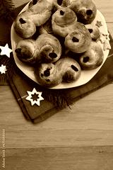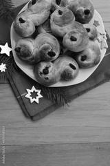 Traditional swedish saffron buns with raisins called Lussekatter on a plate on wooden table with festive Christmas decorations. Homemade baked buns