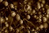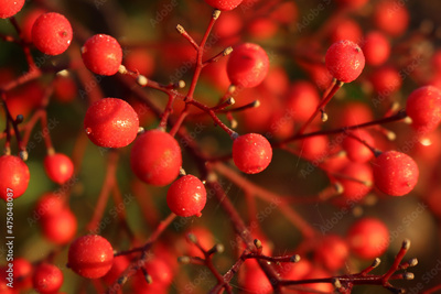 Close-up of bright red Heavenly bamboo berries on branches with frost. Nandina domestica bush on a sunny winter day in the garden