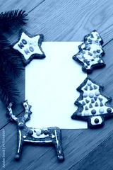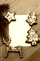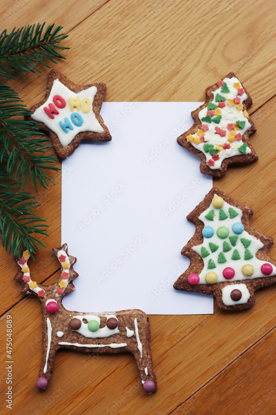 Christmas background with white paper card with copy space ,glazed cookies and pine branches on wooden table. Creative festive layout