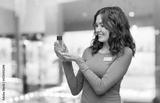 sale, shopping and perfumery concept - happy female assistant with perfume over shop background